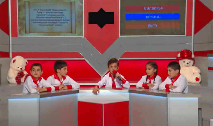 24 Oct, 2015The main goal of this telegame is intellectual education of the new generation considered as an instrument of national security. The young participants compete in their knowledge of native language, literature, history, geography, national traditions, and art of dancing. Each month a tour over one of the historical regions of Armenia is organized for the winners in order to better familiarize them with their country. The films created during the tours serve as an illustrative supplement to the show. Besides the sponsored prizes, the winning team receives the Grand Prize – 7-day tour to Western Armenia.